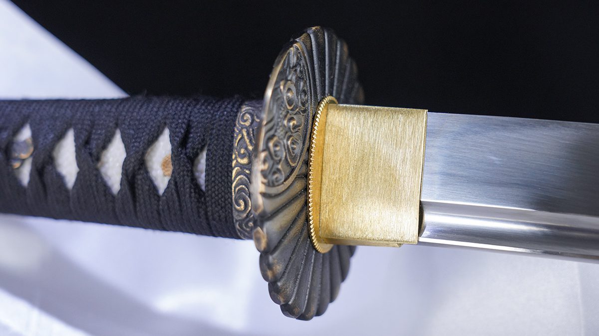 The blade is secured to the wooden Haichi style tsuka with one mekugi. The handle is then covered in white genuine samegawa held in place with artificial silk tsuka ito. It comes sheathed in an oil lacquered saya fitted with brass shitodome and a thickened sageo.