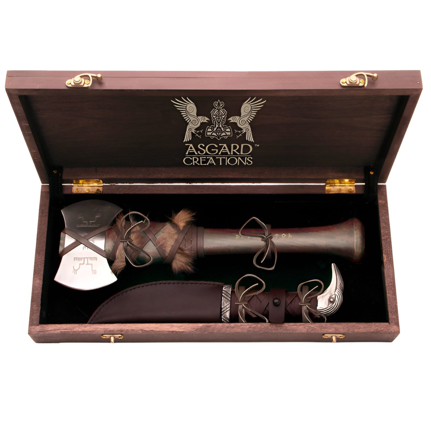 Inspired deeply by Norse mythology, this belt tool set is crafted by Asgard Creations, professionals in creating Norse-like replicas. It captures the essence of Nordic artistry represented by the handle, blade, and axe designs adorned with runic inscriptions, making it suitable for a Viking warrior. Presented in a rustic wooden box, the set is secured with leather straps and contains an axe and a knife.