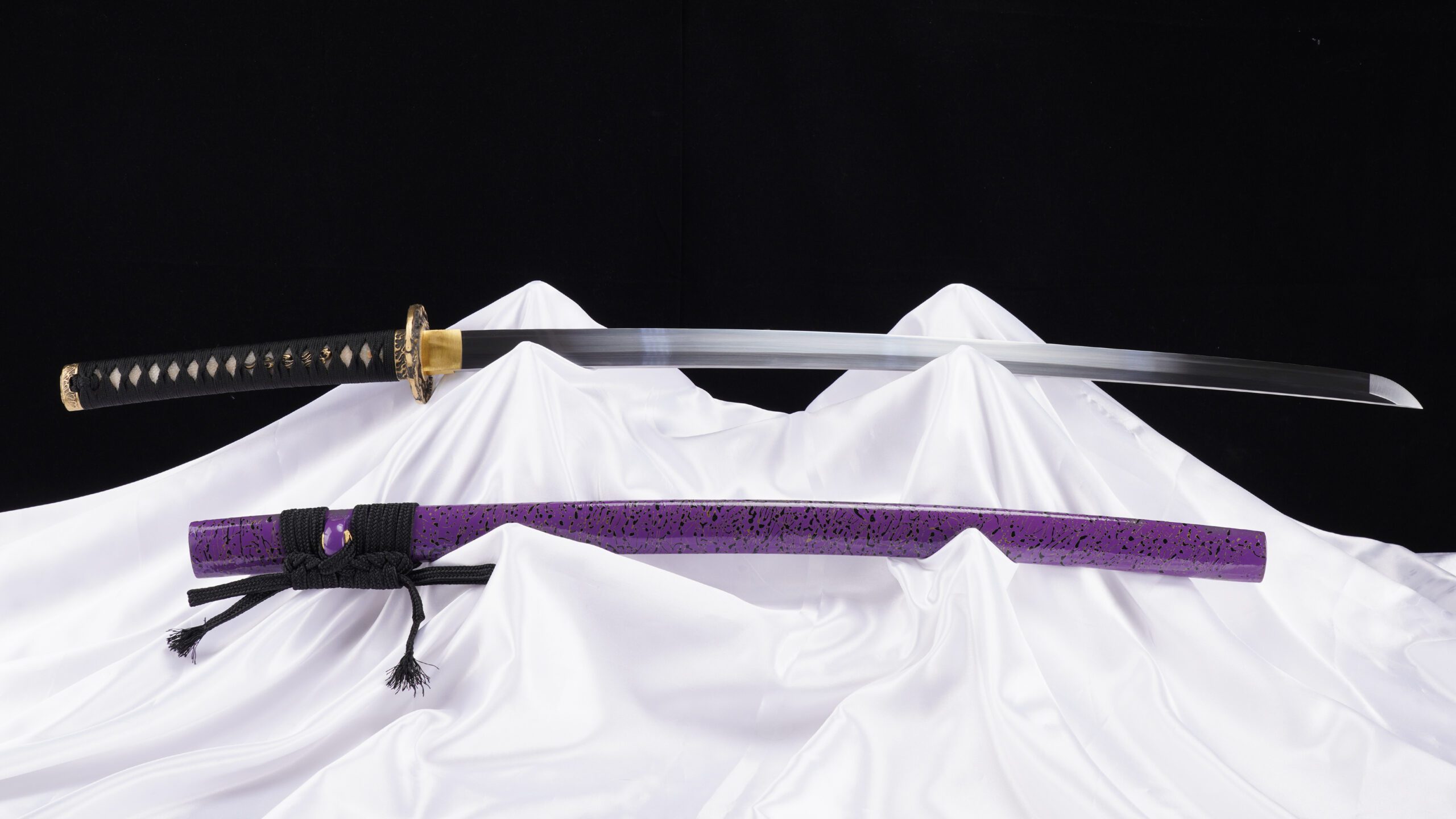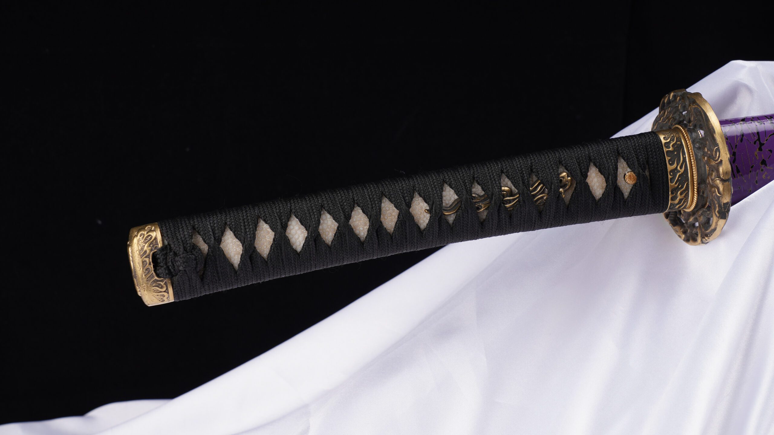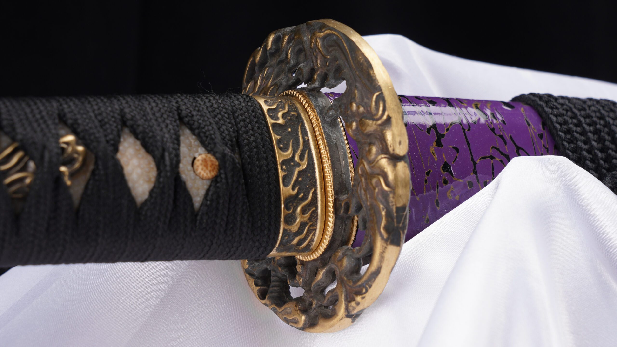 Completing the ensemble is a deep purple lacquered saya with black streaks of black and gold, giving it a striking pattern that blooms across like petals of flame.