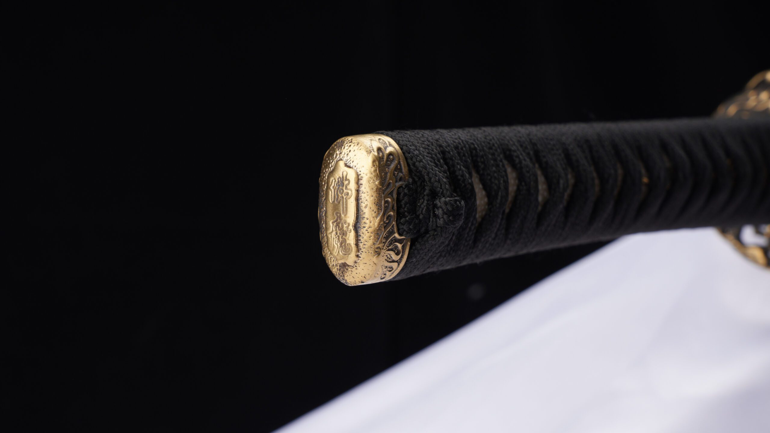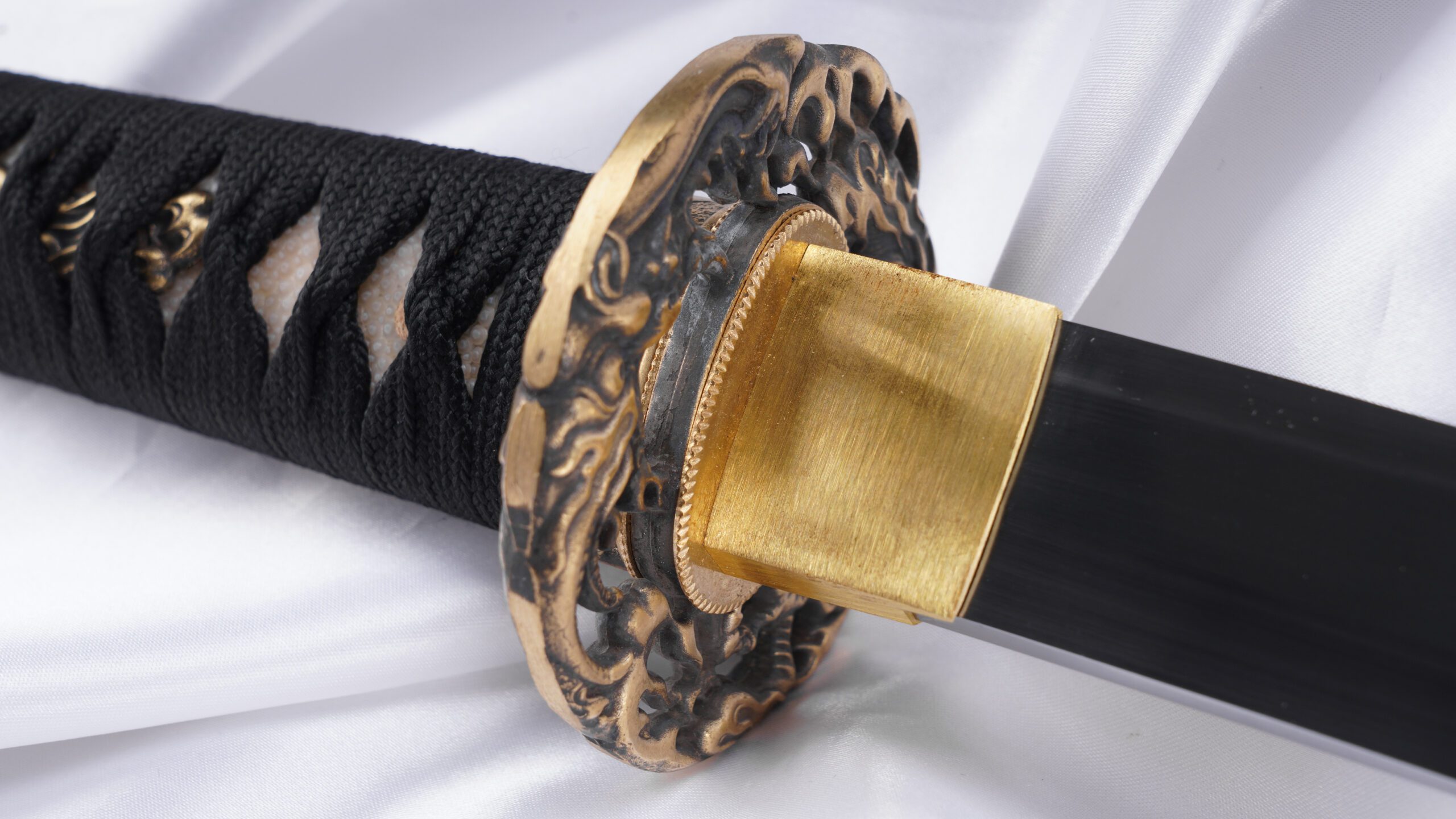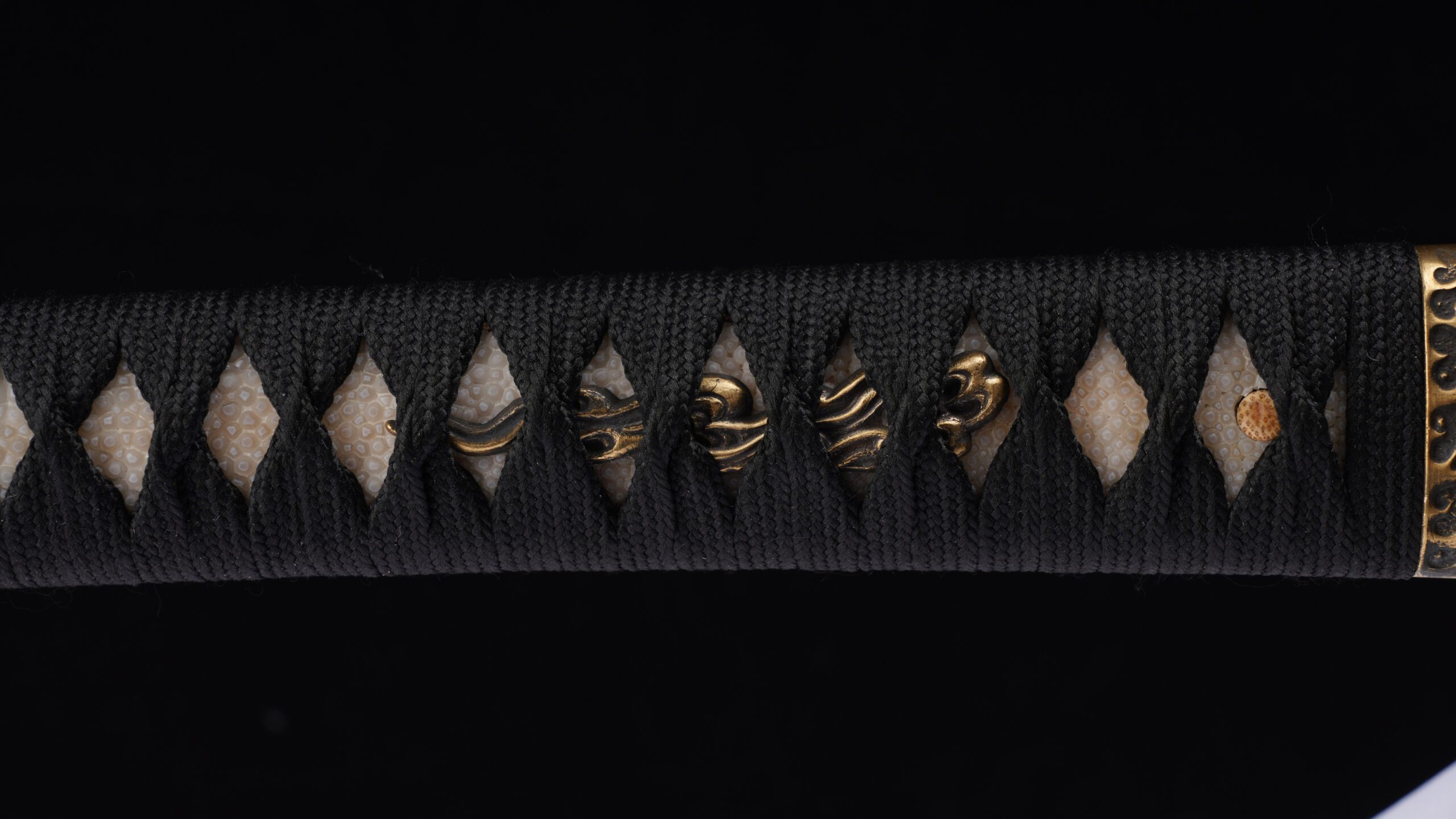 The blackened fittings with gold highlights—including the tsuba, fuchi, kashira, and menuki—complement the gold habaki and seppa, tying in the katana’s overall design. A single mekugi secures the blade to the wooden core tsuka covered in white samegawa and wrapped tightly in black artificial silk tsuka ito for a secure and comfortable grip.