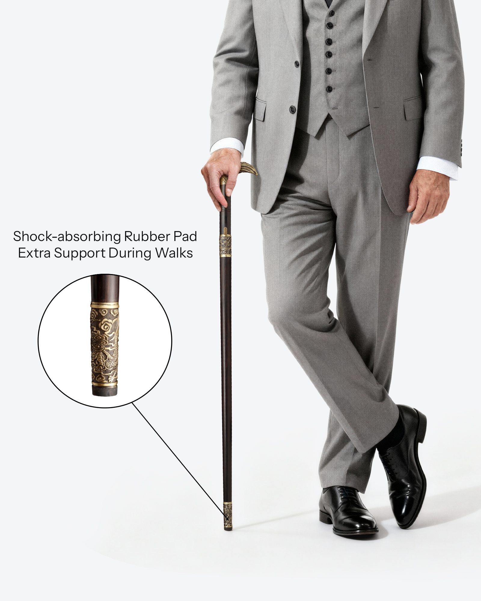 At the base, a shock-absorbing rubber tip pad provides grip and walking stability without drawing attention to the blade inside.