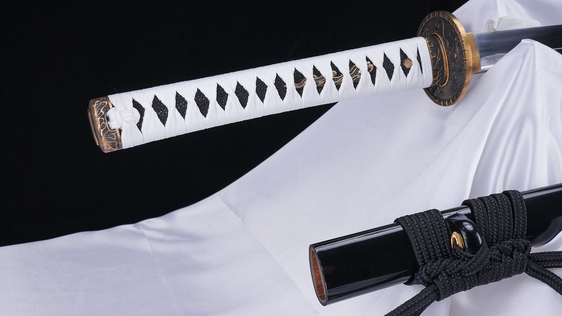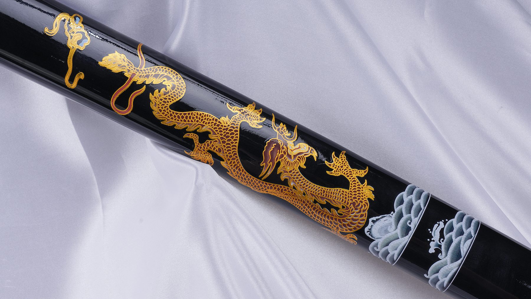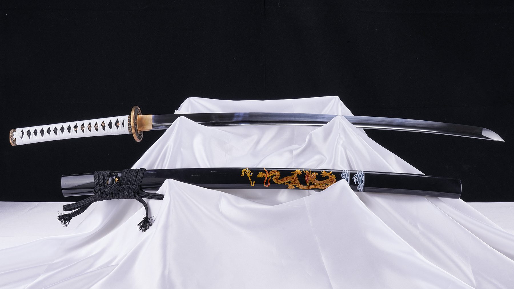 Consistent with the theme is a glossy lacquered black scabbard featuring a golden dragon with black artificial silk sageo.