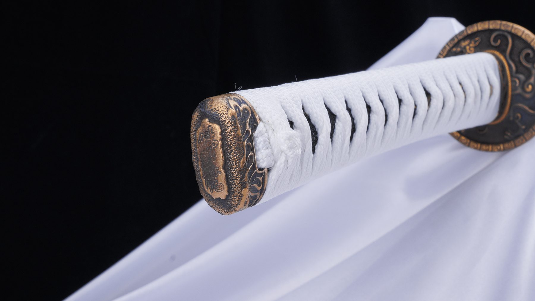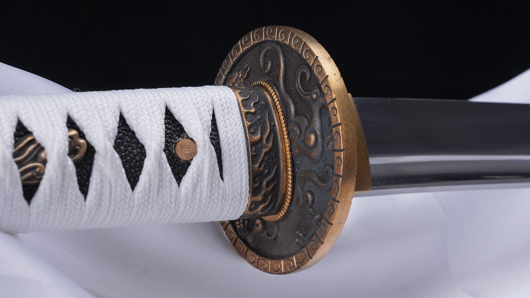 Following tradition, one mekugi secures the blade’s full tang to the wooden core hilt covered in black samegawa with tightly wrapped tsukamaki using white artificial silk tsuka ito for a durable and comfortable grip.