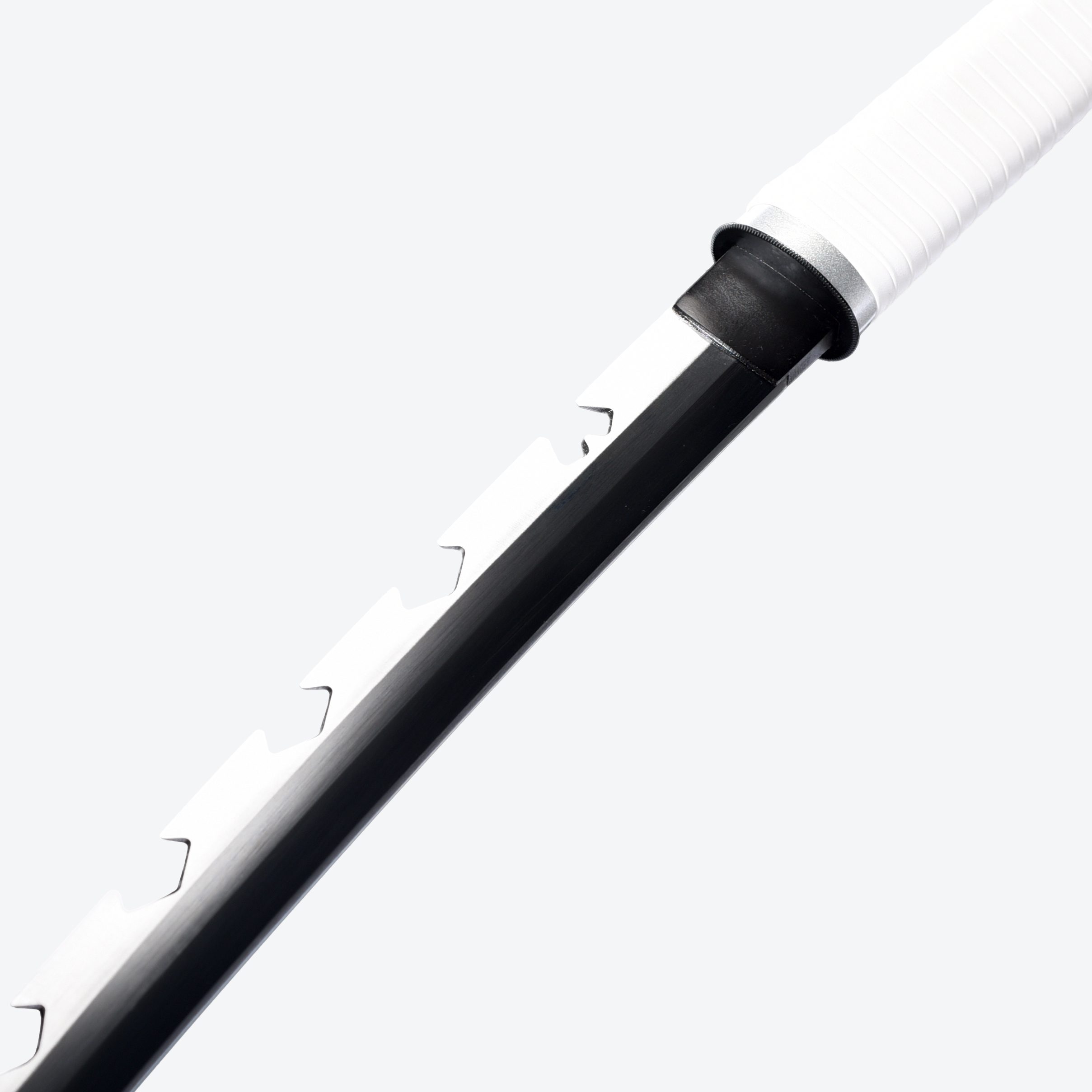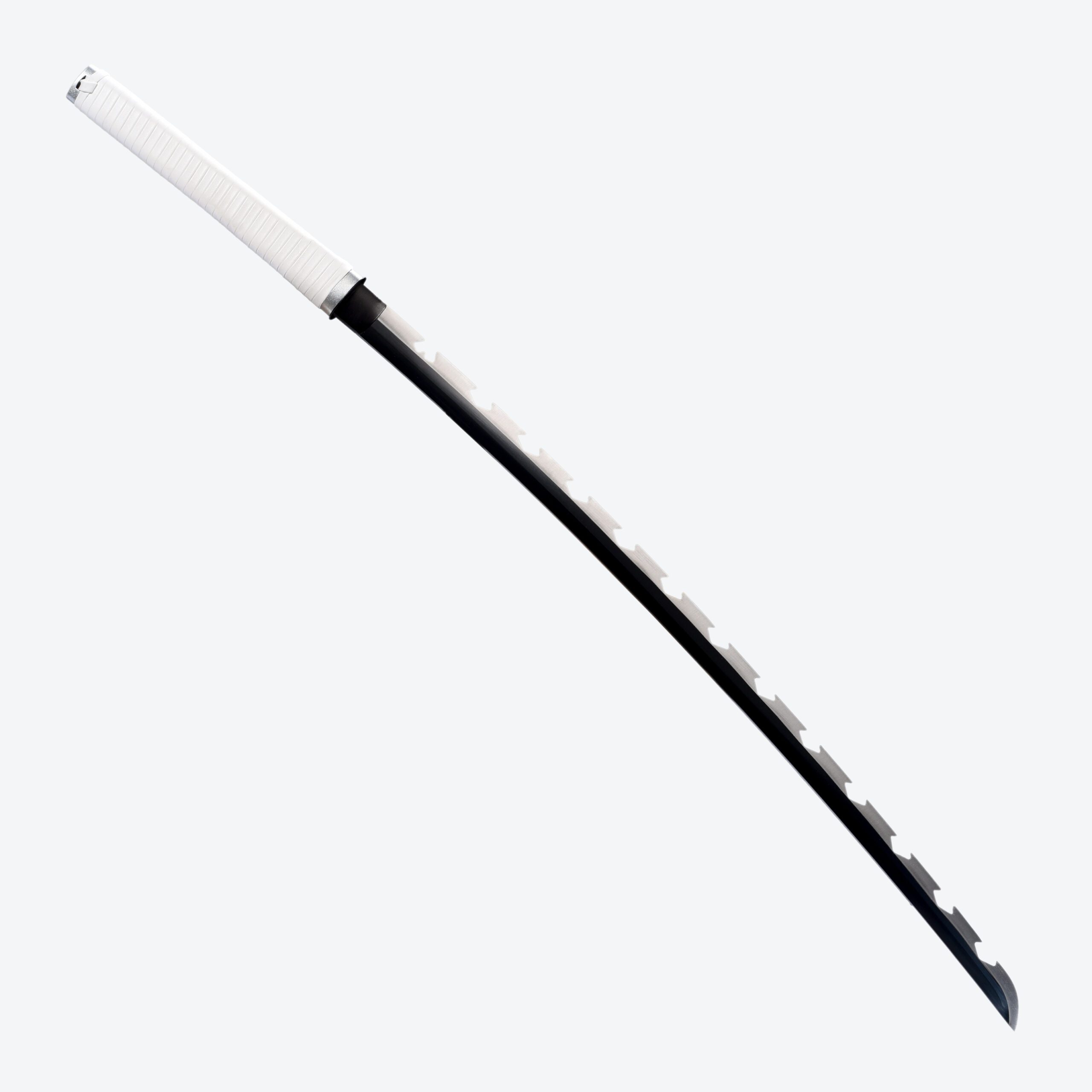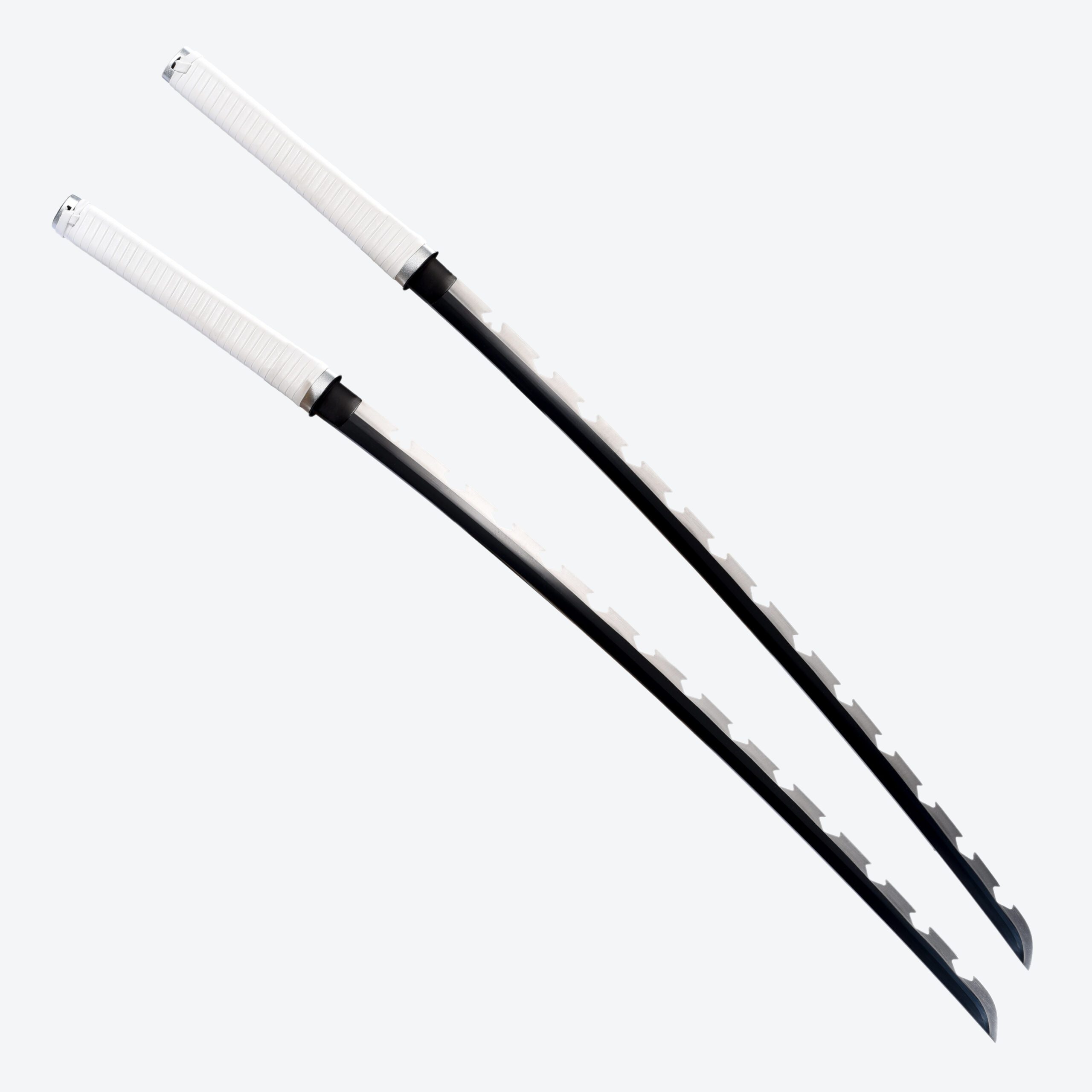 The wooden core handles are wrapped tightly using white leather cords. Like Inosuke’s, both these katanas do not possess traditional scabbards, but they come with an artificial leather sheath and a free sword bag for storage and convenience.