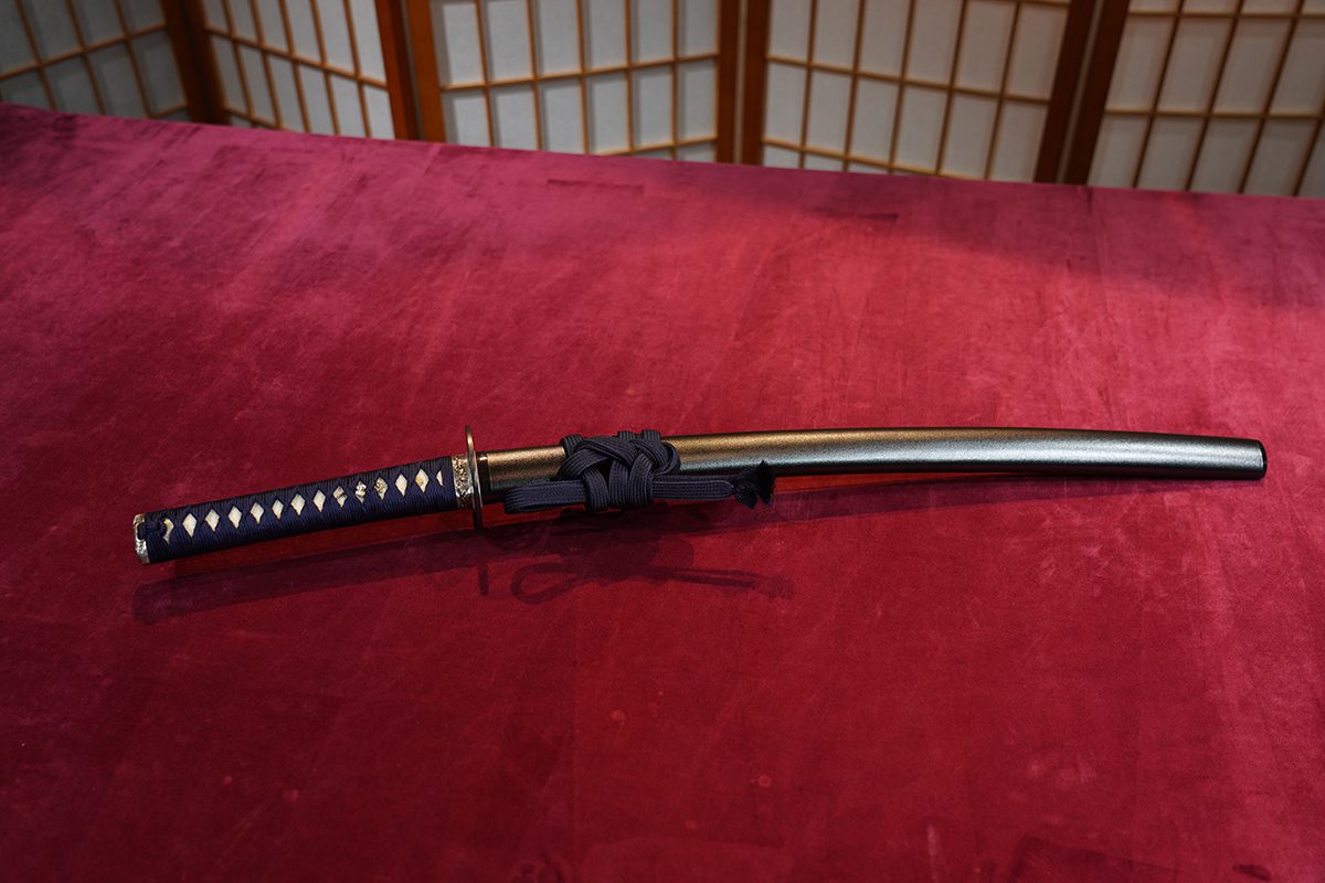The handmade Haichi style tsuka (handle) is covered in normal emperor node white same (rayskin), held in place with blue ito (handle wrap). The wakizashi is sheathed in a black oil lacquered saya (scabbard) with horn koiguchi (mouth of saya), kurigata (knob for sageo), and kojiri (scabbard end cap). The cupronickel shitodome (mounting at kurigata opening) helps to prevent the blue sageo from fraying.