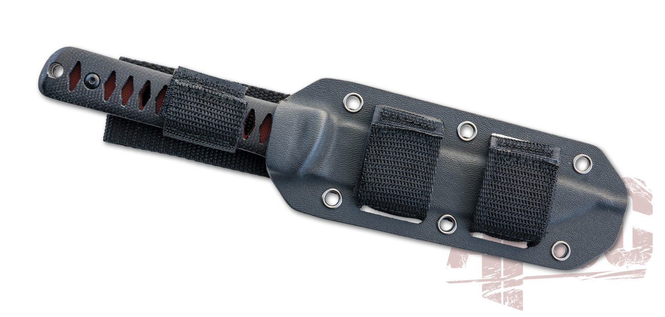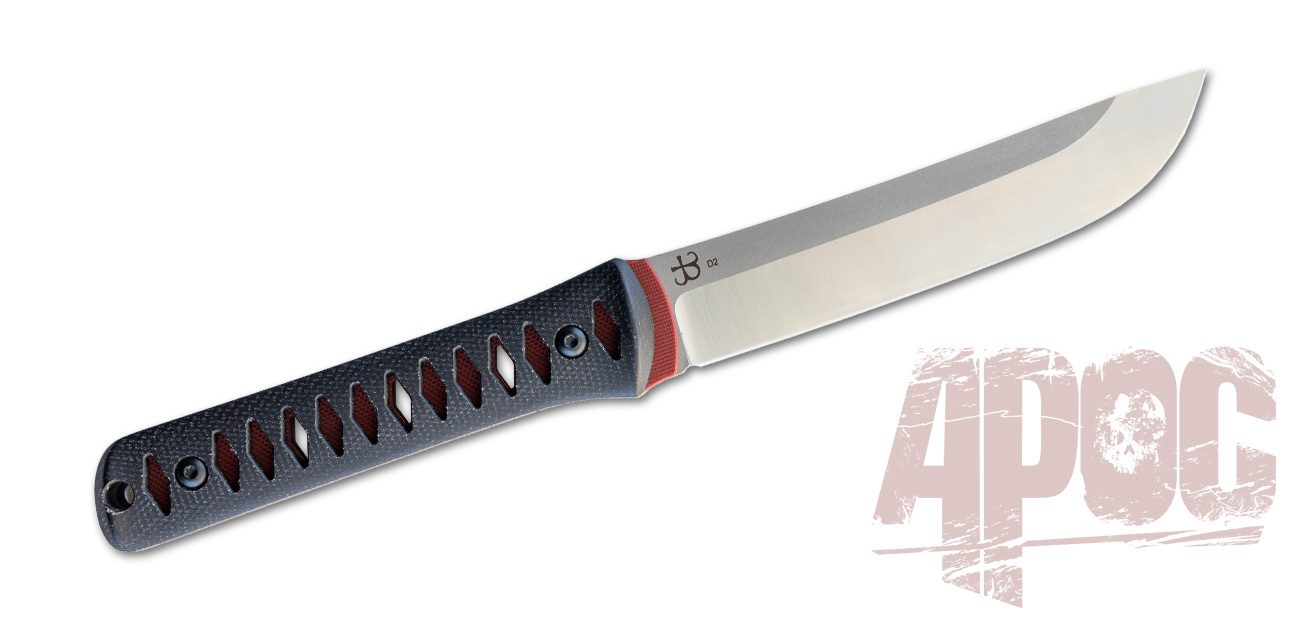 The pierced black canvas Micarta handle with APOC Red G10 liners offers a firm, non-slip grip with comfort that lasts. Designed with cutouts inspired by traditional tsuka-ito wrapping, it feels natural in hand while adding a subtle nod to Japanese craftsmanship.