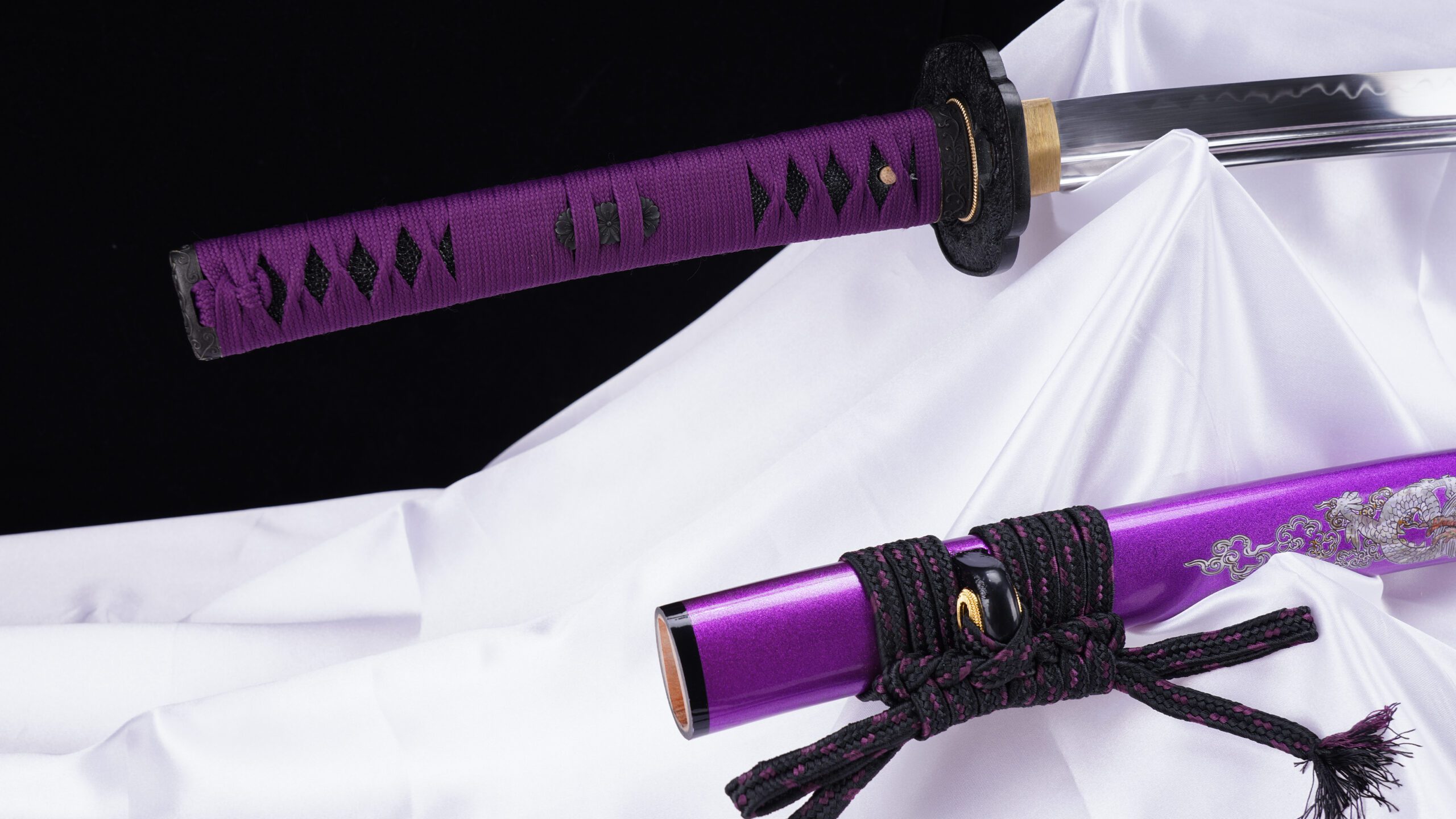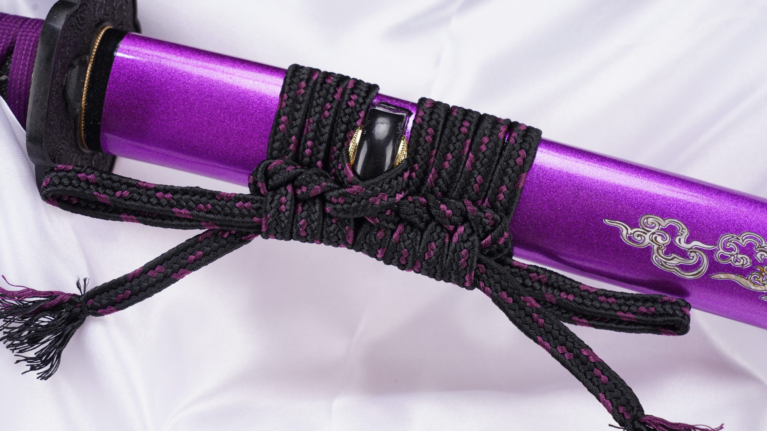 The metallic purple saya shimmers with intricate dragon engravings in gold and silver— a timeless emblem of power and wisdom. A matching black-and-purple _sageo_ completes the design.