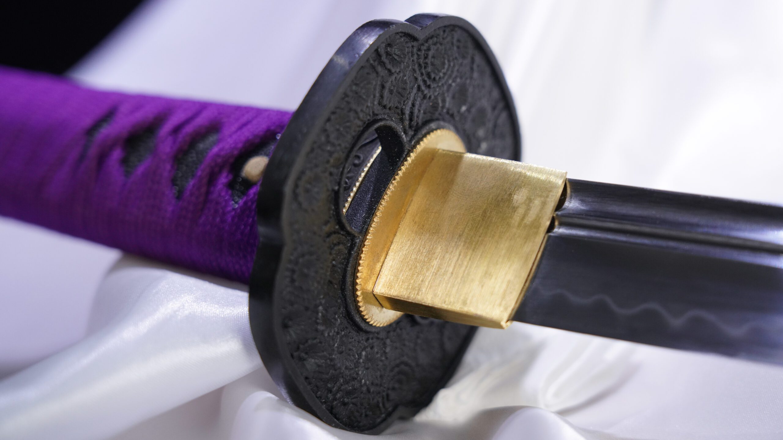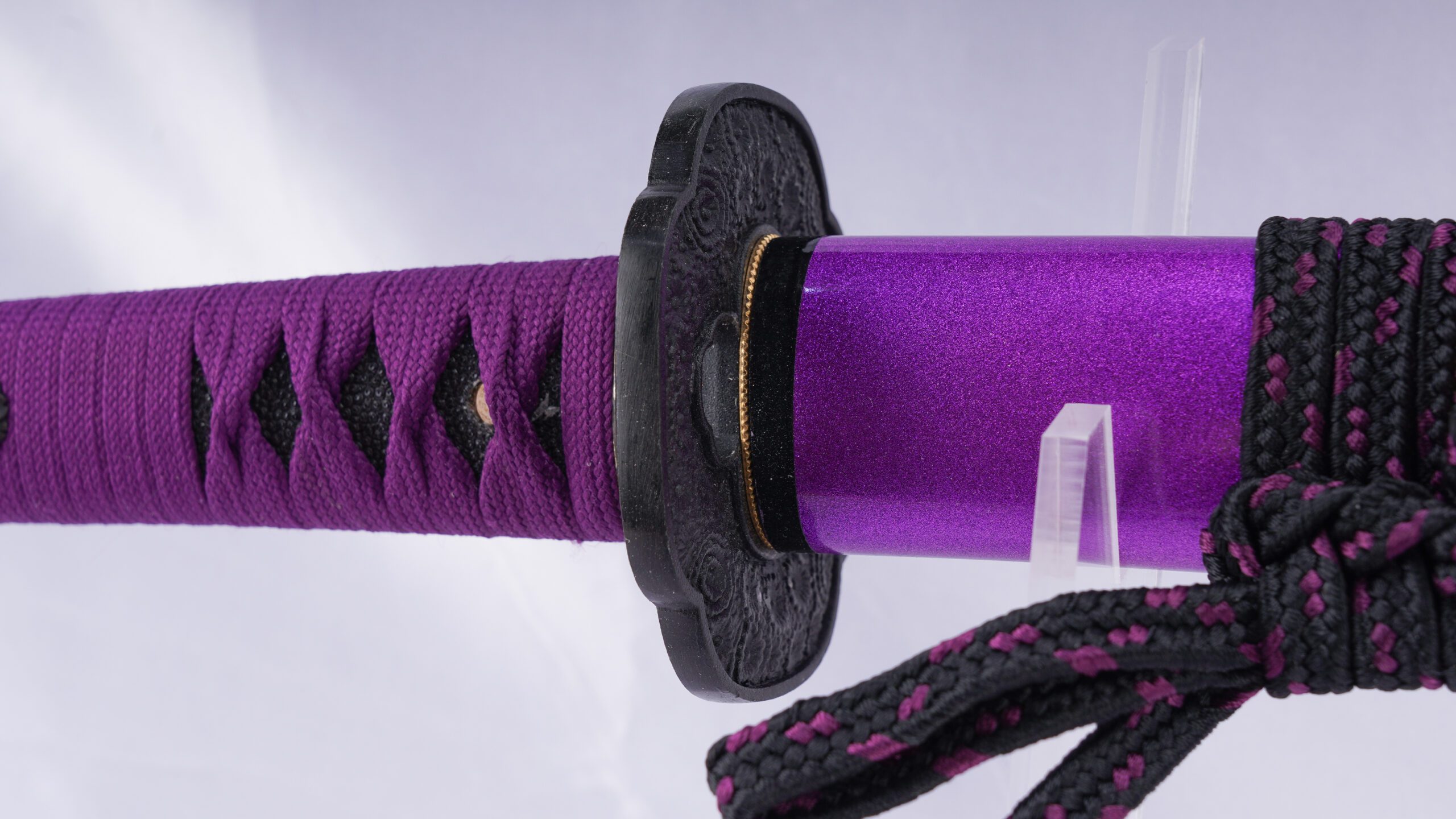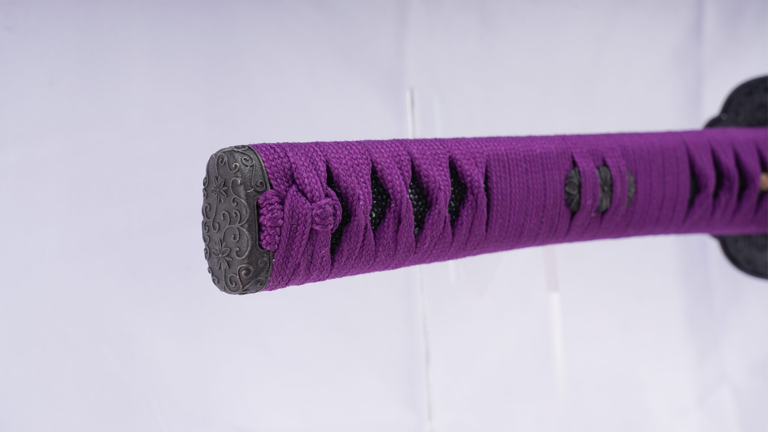 Following tradition, a single _mekugi_ secures the blade to the wooden core handle covered in black samegawa wrapped tightly using a vibrant purple purple _tsuka ito_ for a secure and comfortable grip.