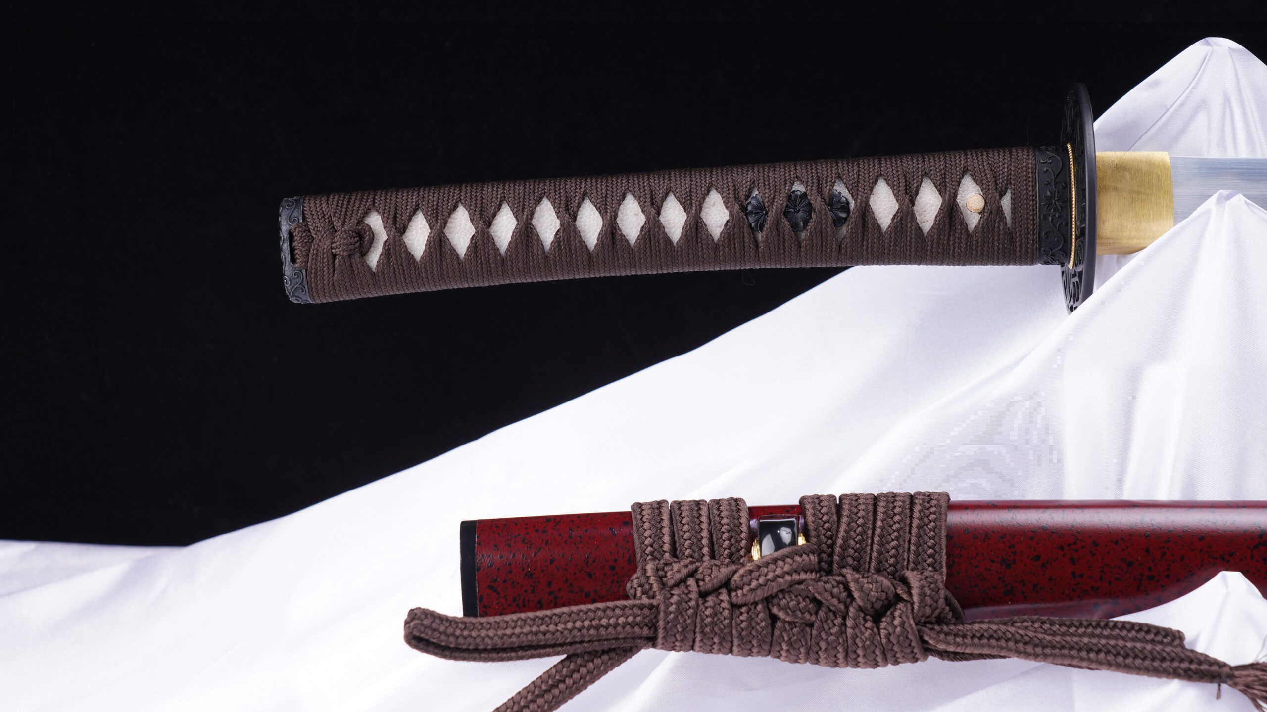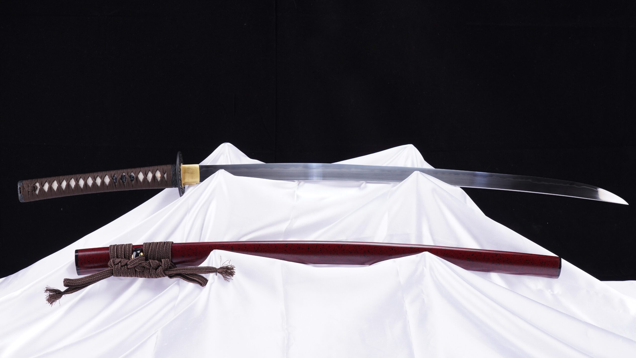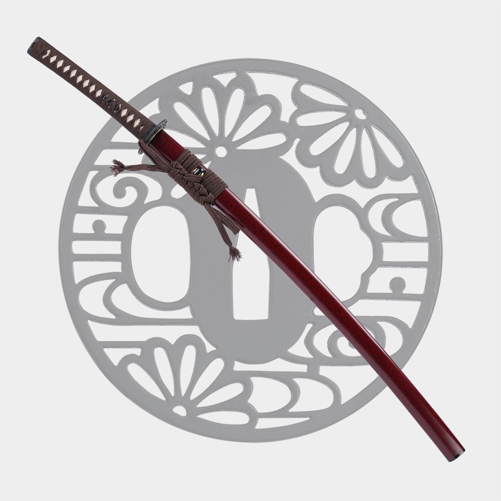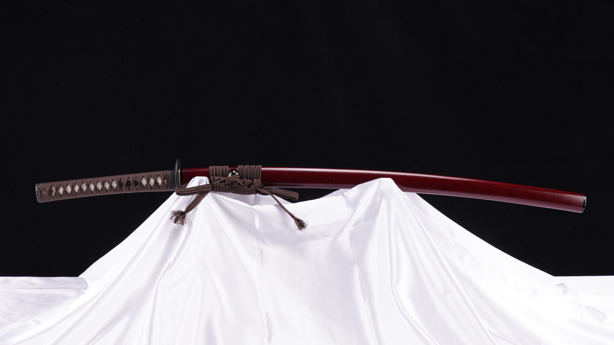 Completing the build is a dark crimson saya with subtle black speckling throughout, giving it depth and a textured, slightly stone-like look rather than a flat gloss. A matching artificial silk sageo is included.