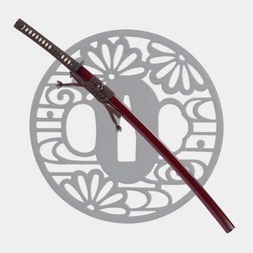The tsuba is finished in a muted silver-gray tone and features an elegant openwork floral motif, adding a clean decorative touch without overpowering the overall design. A single mekugi secures the blade’s full tang to the wooden core tsuka, covered in black samegawa and wrapped with tightly done tsukamaki using red artificial silk tsuka ito.